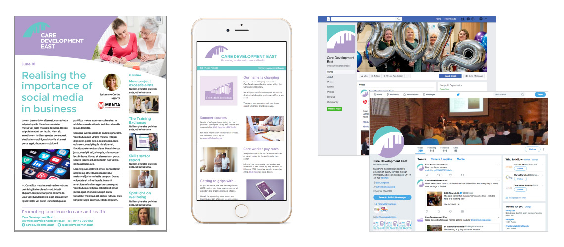 The purple colour was heavily used in the original Suffolk Brokerage visual identity and for this reason we decided to retain it for the new Care Development East brand. Alongside this, we introduced a new green to provide a contrasting highlight. Using these colours in combination really helped with services users being able to quickly identify Care Development East and their information.