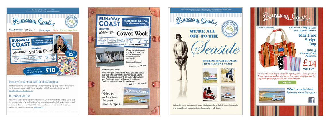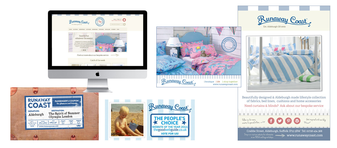 Runaway Coast were a high end homewear retailer based in Aldeburgh, Suffolk. They produced and sold to both to consumer and trade, a variety of bedding, cushions and other home products. Working with Runaway Coast Runaway we developed a fun and attractive brand which proved very popular amongst their local and national customers.  The business expanded operations into London and various other pop up shops and trade customers.