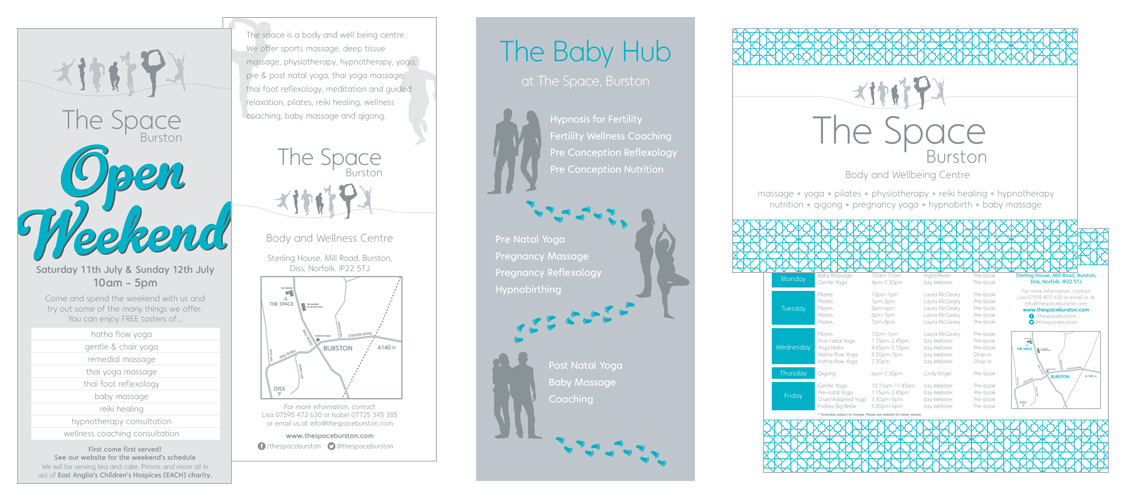 We developed a logo which combined yoga poses with silhouettes of everyday people enjoying movement. It was important to demonstrate The Space was for all types of customer as they needed to illustrate that they offered both wellbeing classes as well as specialised treatments. The logo therefore shows a runner to demonstrate sports massage, a gardener to show treatments for all ages and a young mother to show how they offer classes for babies and parents. The use of grey is designed to give the logo and identity a calming effect and to be used as a colour pallet within the building.